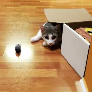Catticus loves to stalk from under the flaps of a box! The breakfast shakes are keeping the box from sliding so much.