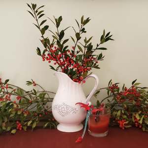 I love decorating with holly from my own yard. This is, just like my Christmas tree, shut behind the door where Catticus can’t reach it.
