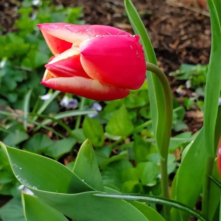 Here are those blooming tulips from last week — but not through a screen, past a cat. This time, they get their own close up. I love the two-toned ones.
