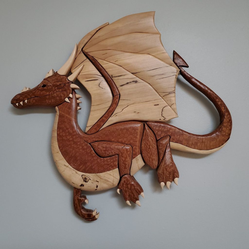 My intarsia dragon from the “Happy Dragon” pattern is done! Except for the center of the eye. It’s predominately birch, leopardwood, and spalted maple, with ebony for the dark of the eye. No wood coloration was altered, that’s how it naturally comes.