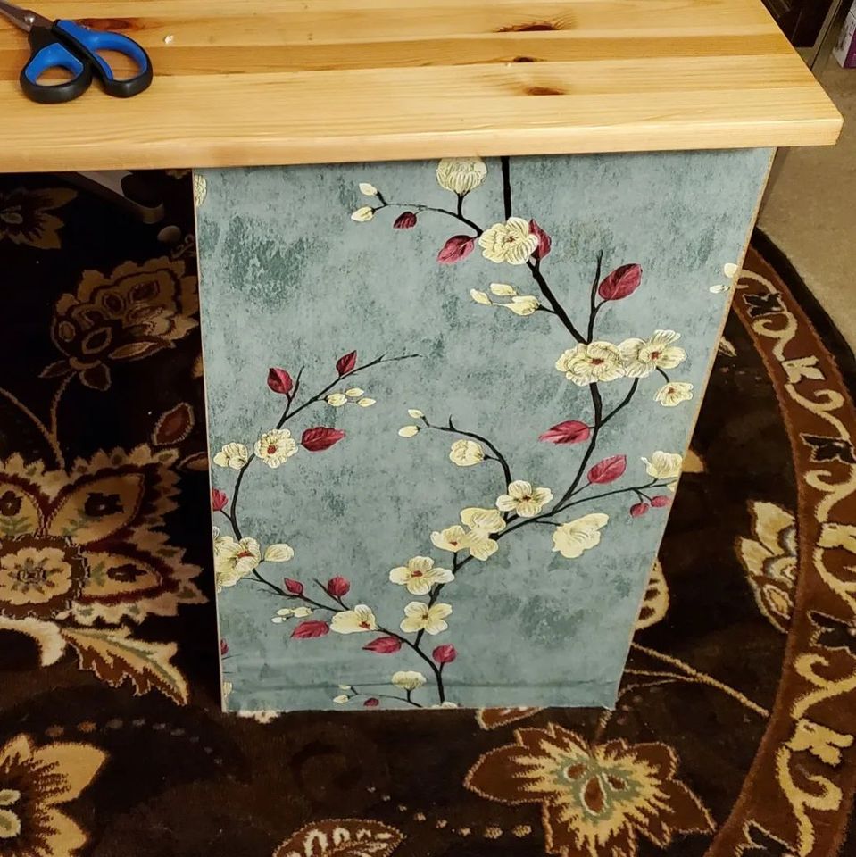I’d call it a 10-minute upgrade, but I spent a couple hours deciding against painting or veneer, and picking the exact peel-and-stick wallpaper to spruce up this desk I got over a decade ago.