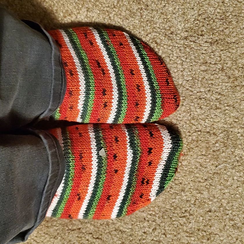 My mom’s a knitter, so much so that my niece has dubbed her “Grandma-who-knits”. Here are a pair of ADORABLE watermelon socks I just got from her during my last visit.