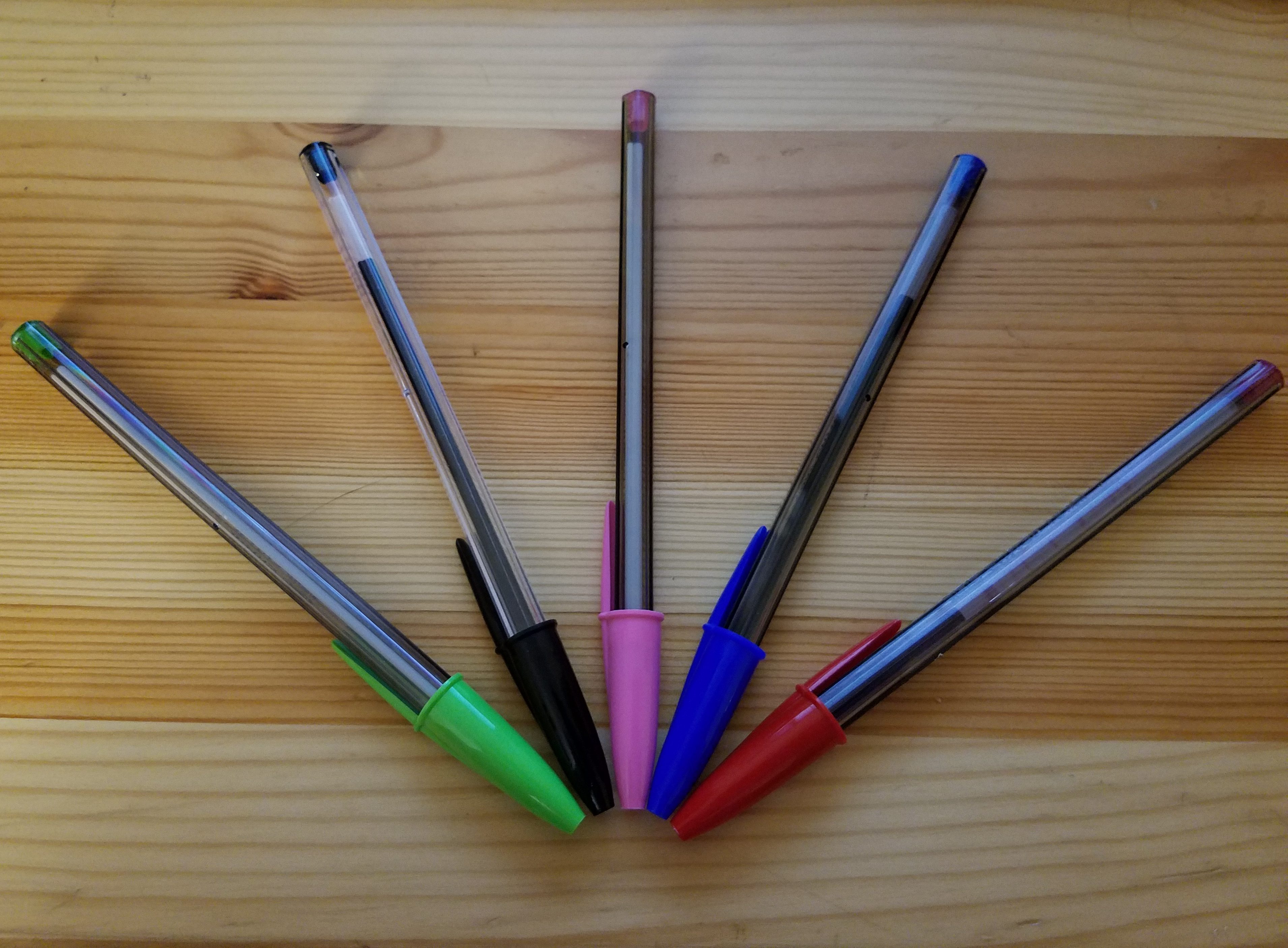 wp-1471407391476.jpg August 17, 2016Full resolution (3820 × 2812) All of my Bic editing pens. I meant to color code but haven't really been doing that. Just using different colors for different things. 5 Bic pens fanned out. Green, black, pink, blue, and red.